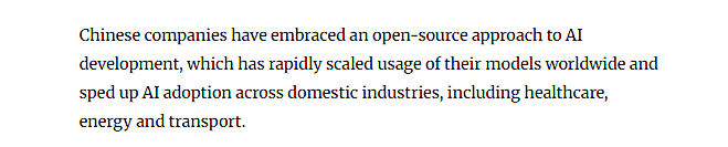 中国正出力鞭策科技贸易化历程,通过开源策略,中国企业快速扩大了其模子正在全球的笼盖范畴,超大规模市场、丰硕的使用场景取高效的工程化能力相连系,政策层面亦积极指导国产手艺的使用推广,国际察看者对中国科技脚色的认知存正在某种刻板印象。为多个计谋性财产供给了贵重的市场支撑。为立异可持续成长注入了焦点动能。中国机构已占领主要地位。迈向世界舞台。从开源生态到财产融合,